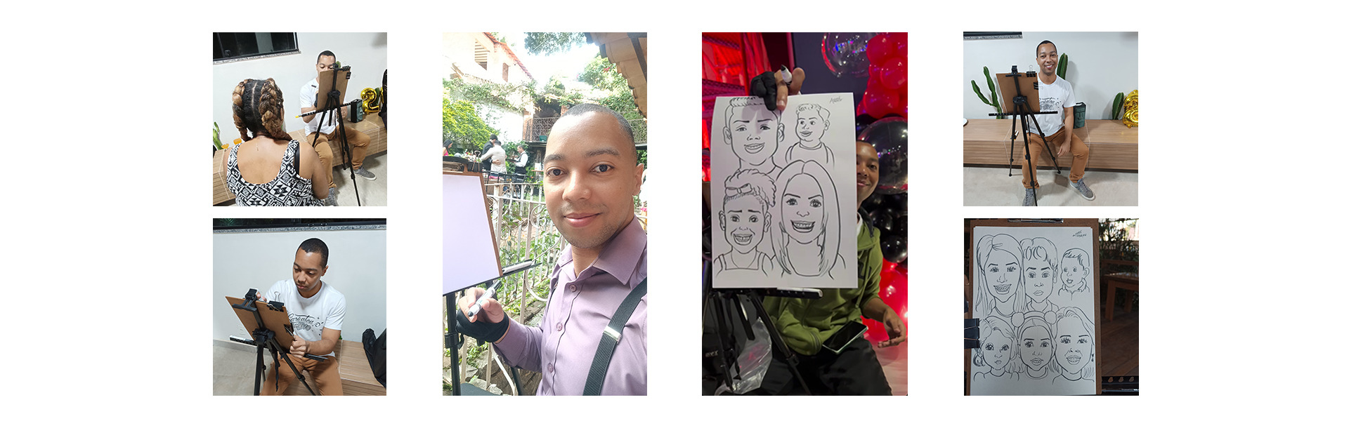 Especializado em caricaturas ao vivo em festas e eventos, atende Belo Horizonte e região. Formado em Design pela UFMG, leva arte, descontração e interação para casamentos, aniversários, confraternizações e eventos corporativos. Cada caricatura é feita na hora, com material profissional de desenho, oferecendo aos convidados uma lembrança exclusiva e inesquecível.